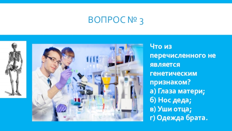 Вопрос № 3Что из перечисленного не является генетическим признаком? а) Глаза матери; б) Нос деда; в) Уши