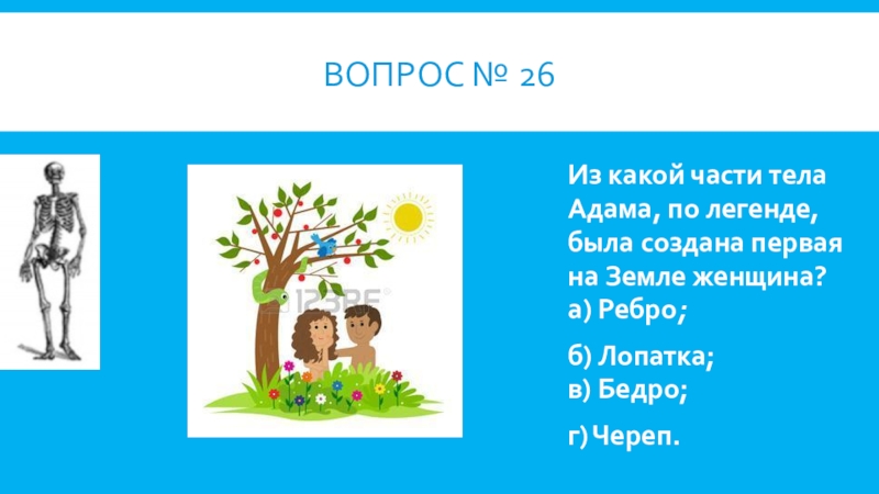 Вопрос № 26Из какой части тела Адама, по легенде, была создана первая на Земле женщина? а) Ребро;б)