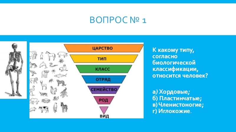 Вопрос № 1 К какому типу, согласно биологической классификации, относится человек? а) Хордовые; б) Пластинчатые; в) Членистоногие; г) Иглокожие.