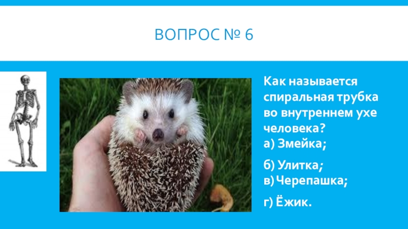 Вопрос № 6Как называется спиральная трубка во внутреннем ухе человека? а) Змейка;б) Улитка; в) Черепашка;г) Ёжик.
