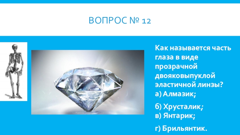 Вопрос № 12Как называется часть глаза в виде прозрачной двояковыпуклой эластичной линзы? а) Алмазик;б) Хрусталик; в) Янтарик;г)
