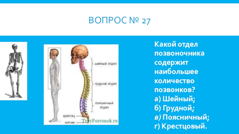 Вопрос № 27Какой отдел позвоночника содержит наибольшее количество позвонков? а) Шейный; б) Грудной; в) Поясничный; г) Крестцовый.