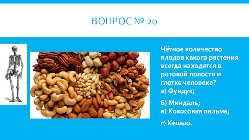 Вопрос № 20Чётное количество плодов какого растения всегда находятся в ротовой полости и глотке человека? а) Фундук;б)