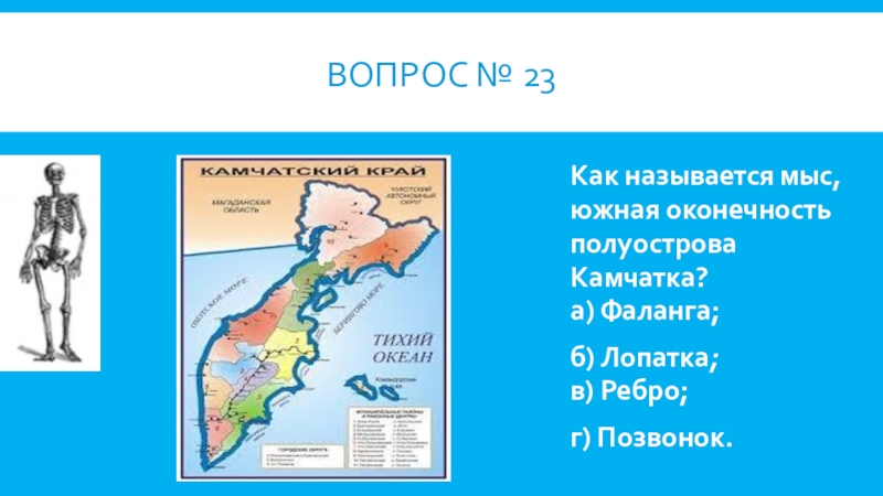 Вопрос № 23Как называется мыс, южная оконечность полуострова Камчатка? а) Фаланга;б) Лопатка; в) Ребро;г) Позвонок.