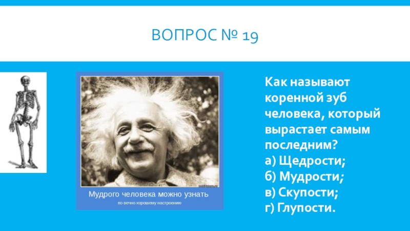 Вопрос № 19Как называют коренной зуб человека, который вырастает самым последним? а) Щедрости; б) Мудрости; в) Скупости;