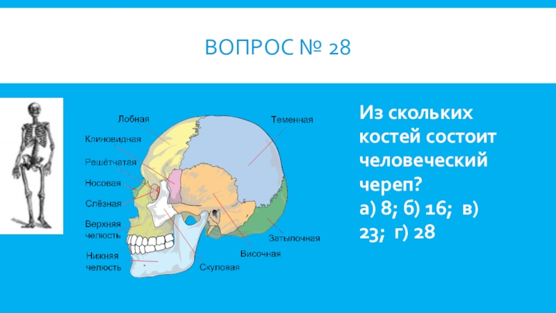 Вопрос № 28Из скольких костей состоит человеческий череп? а) 8; б) 16; в) 23; г) 28