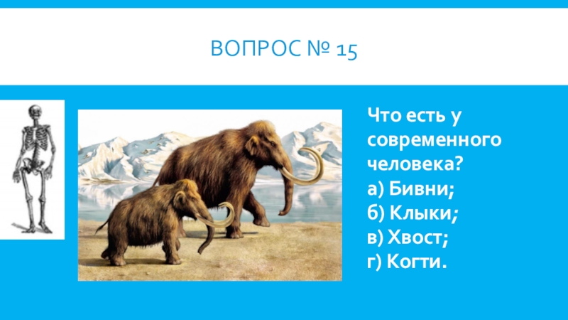 Вопрос № 15Что есть у современного человека? а) Бивни; б) Клыки; в) Хвост; г) Когти.