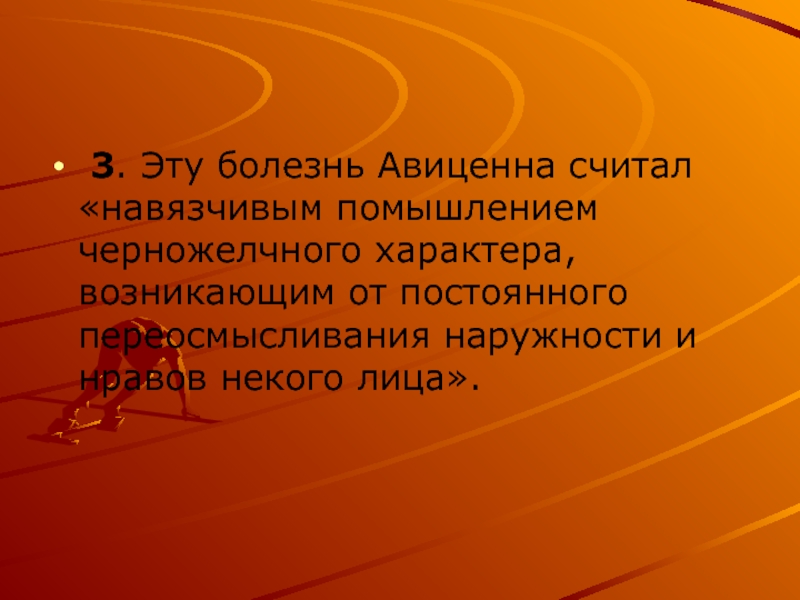 Слайд 47 3. Эту болезнь Авиценна считал «навязчивым помышлением черножелчного характера, возникающим