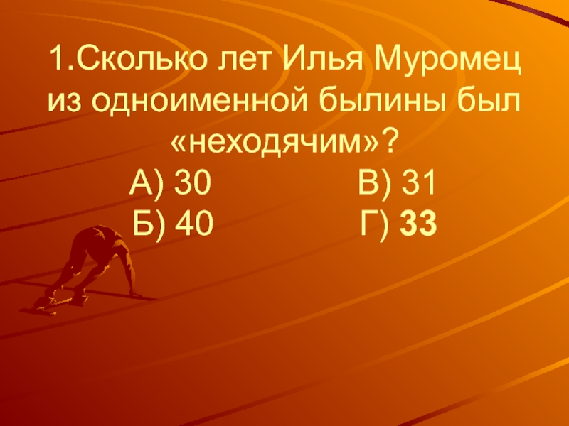 Слайд 31.Сколько лет Илья Муромец из одноименной былины был «неходячим»?