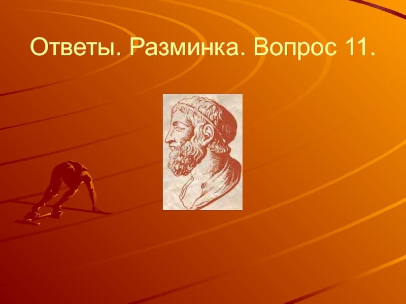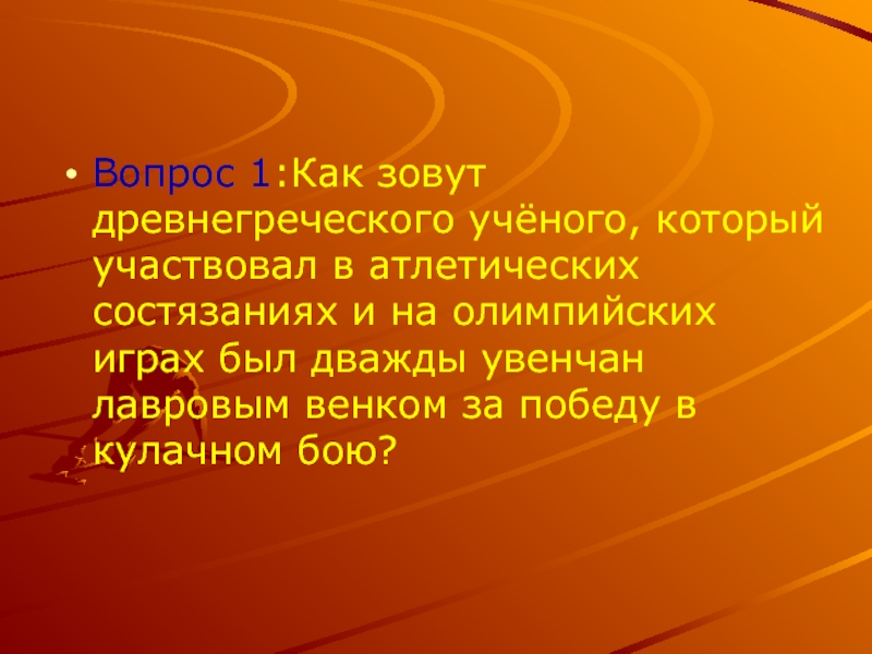 Слайд 36Вопрос 1:Как зовут древнегреческого учёного, который участвовал в атлетических состязаниях и