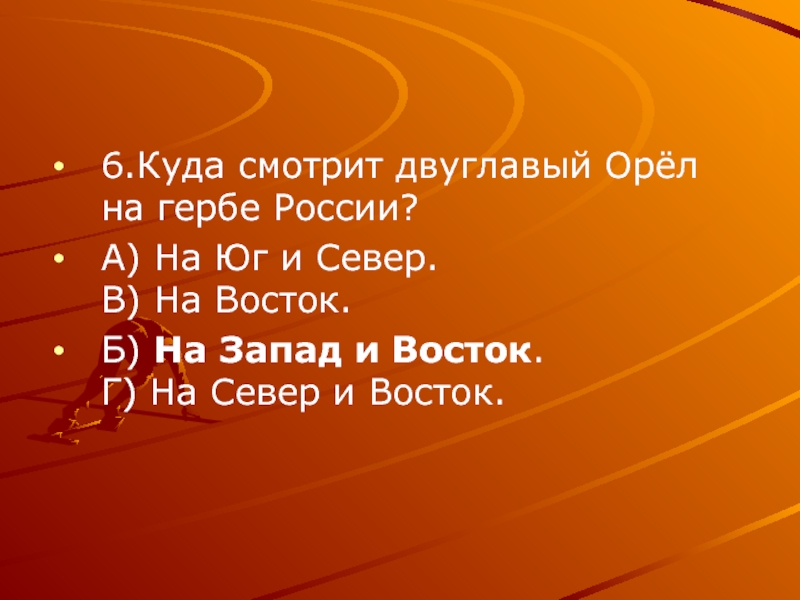 Слайд 86.Куда смотрит двуглавый Орёл на гербе России?