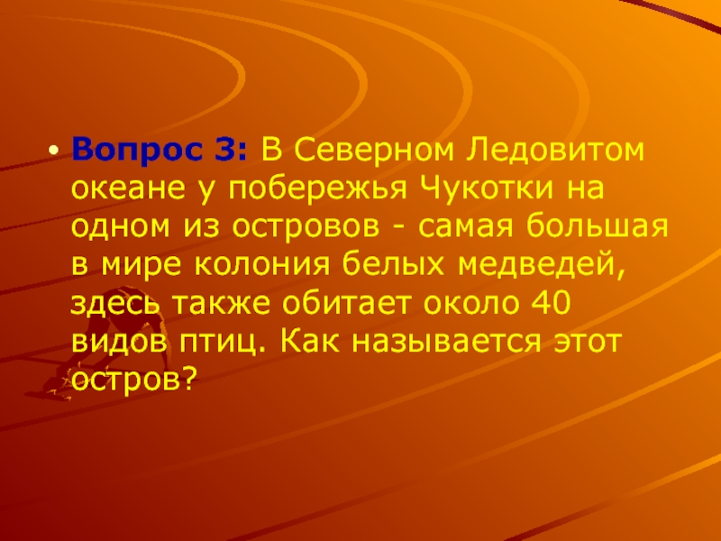 Слайд 38Вопрос 3: В Северном Ледовитом океане у побережья Чукотки на одном