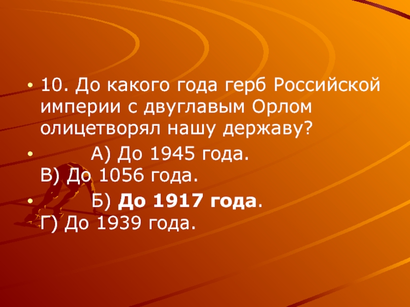 Слайд 1210. До какого года герб Российской империи с двуглавым Орлом олицетворял