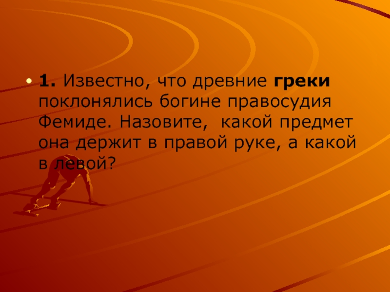 Слайд 451. Известно, что древние греки поклонялись богине правосудия Фемиде. Назовите, какой