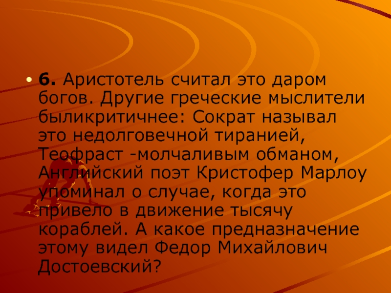Слайд 506. Аристотель считал это даром богов. Другие греческие мыслители быликритичнее: Сократ