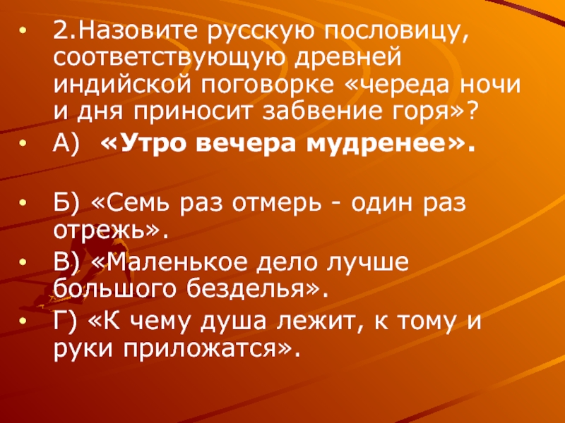 Слайд 42.Назовите русскую пословицу, соответствующую древней индийской поговорке «череда ночи и дня