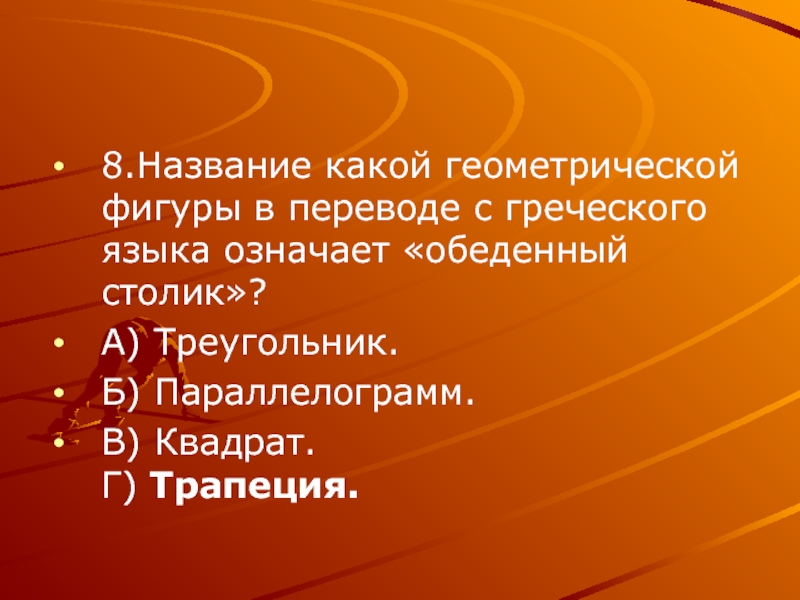 Слайд 108.Название какой геометрической фигуры в переводе с греческого языка означает «обеденный