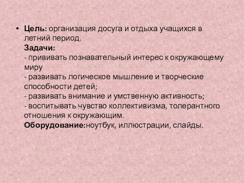 Слайд 3Цель: организация досуга и отдыха учащихся в летний период.