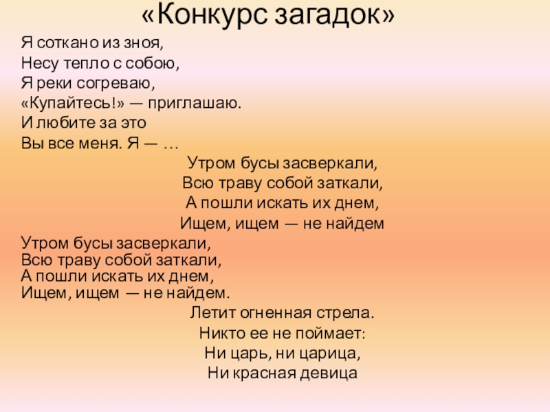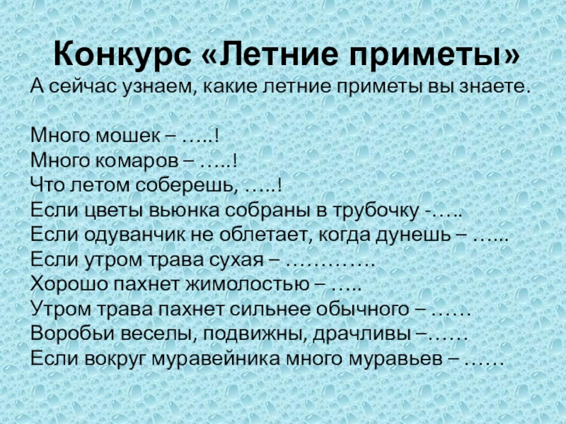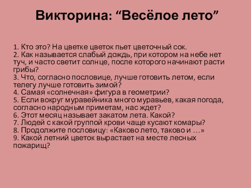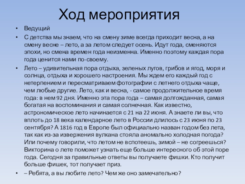 Лето – удивительная пора отдыха, зеленых лугов, грибов и ягод, моря и солнца, отдыха и хорошего настроения. Мы ждем его каждый год с нетерпением и пересматриваем фотографии с летнего отдыха чаще, чем любые другие. Лето, как и весна, - самое продолжительное время года: в нем 92 дня. Именно эта пора года – самая долгожданная, самая богатая на воспоминания и самая солнечная. Как известно, астрономическое лето начинается с 21 на 22 июня. А знаете ли вы, что вплоть до 18 века календарное лето в России длилось с 23 июня по 23 сентября? А 1816 год в Европе был официально назван годом без лета, так как из-за извержения вулкана стояла аномально холодная погода? Или почему говорили, что летом не вспотеешь, зимой – не согреешься? Викторина о лете поможет узнать еще больше интересного об этой поре года. Сегодня за правильные ответы вы получаете фишки. Кто получит больше фишек, тот получает приз.