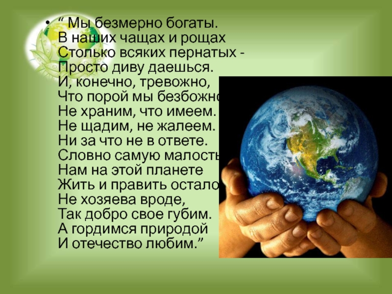 Слайд 3Охрану природы я считаю делом святым. Это – сохранение и умножение