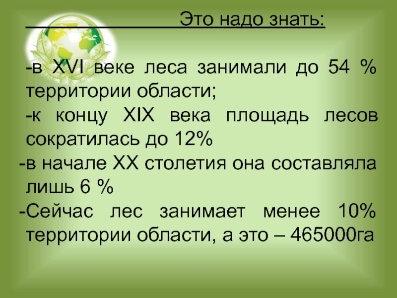 Сейчас лес занимает менее 10% территории области, а это – 465000га