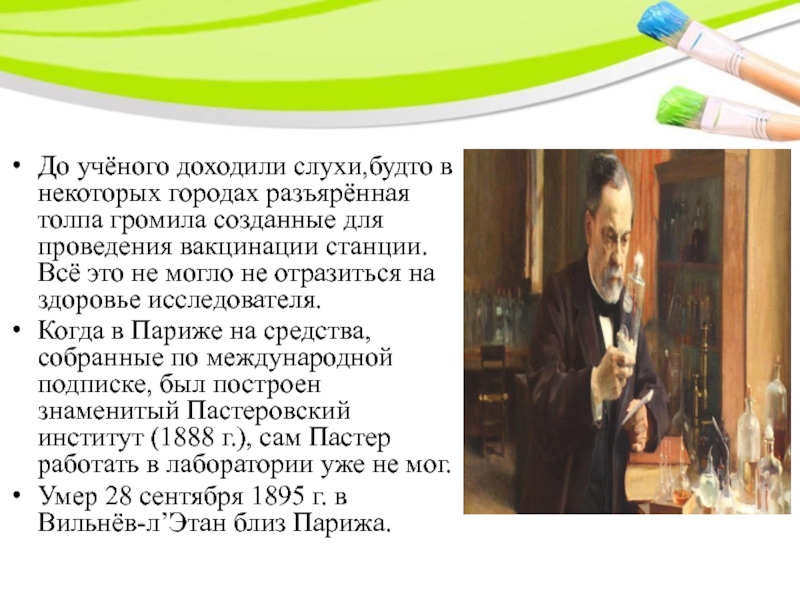 Когда в Париже на средства, собранные по международной подписке, был построен знаменитый Пастеровский институт (1888 г.), сам Пастер работать в лаборатории уже не мог.