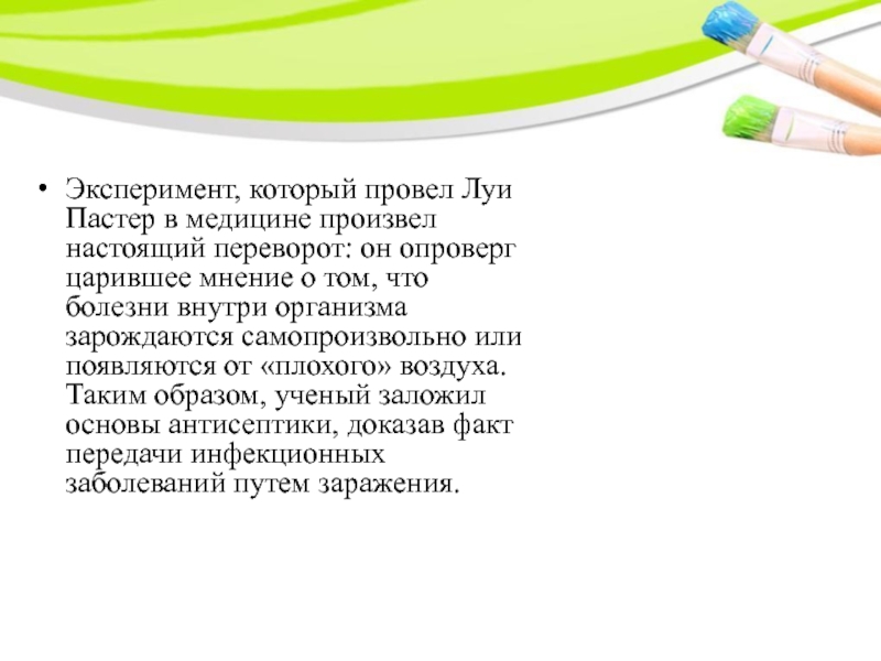 Слайд 10Эксперимент, который провел Луи Пастер в медицине произвел настоящий переворот: он