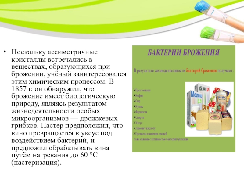 Слайд 5Поскольку ассиметричные кристаллы встречались в веществах, образующихся при брожении, учёный заинтересовался