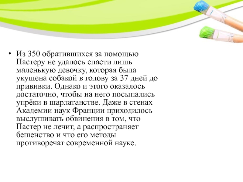 Слайд 8Из 350 обратившихся за помощью Пастеру не удалось спасти лишь маленькую
