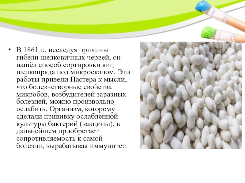 Слайд 6В 1861 г., исследуя причины гибели шелковичных червей, он нашёл способ