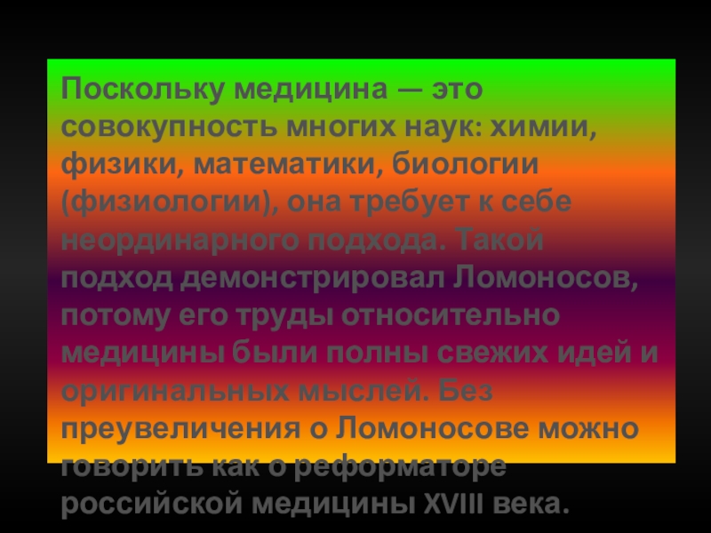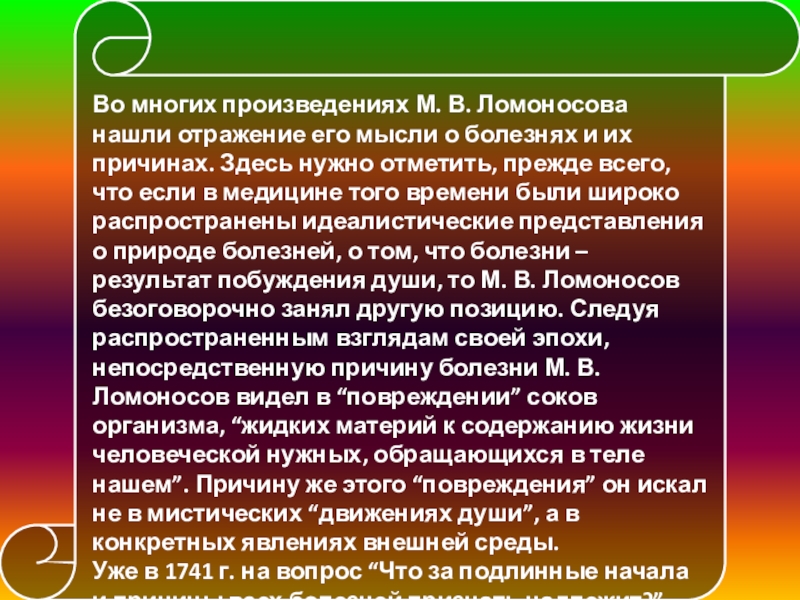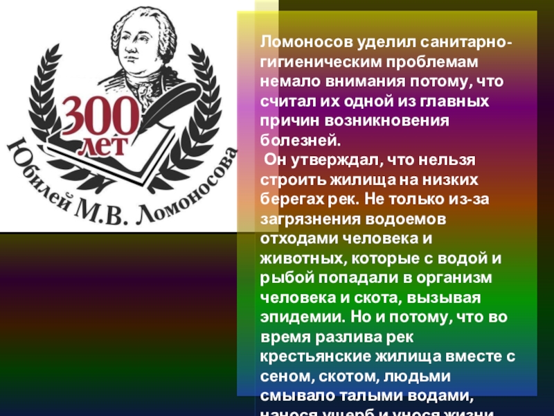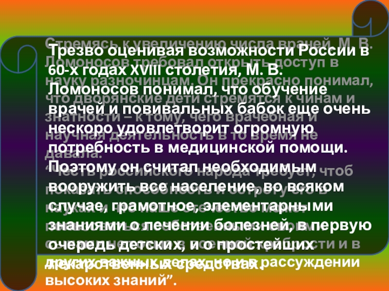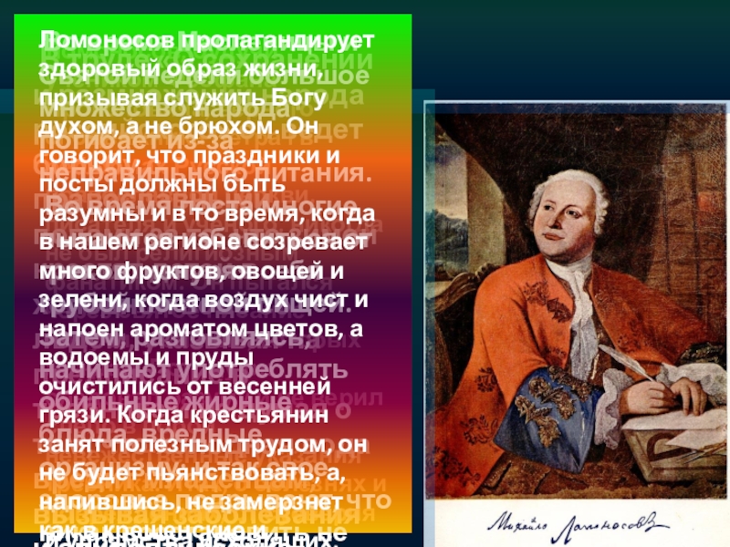 Ломоносов пропагандирует здоровый образ жизни, призывая служить Богу духом, а не брюхом. Он говорит, что праздники и посты должны быть разумны и в то время, когда в нашем регионе созревает много фруктов, овощей и зелени, когда воздух чист и напоен ароматом цветов, а водоемы и пруды очистились от весенней грязи. Когда крестьянин занят полезным трудом, он не будет пьянствовать, а, напившись, не замерзнет как в крещенские и рождественские стужи.
