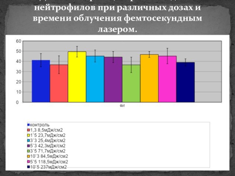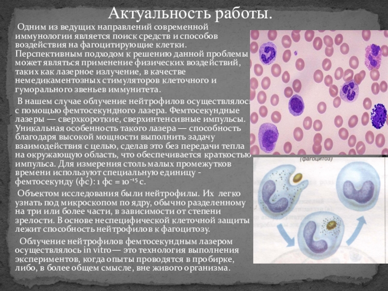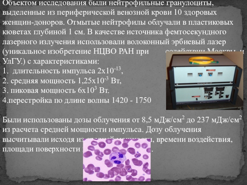 В нашем случае облучение нейтрофилов осуществлялось с помощью фемтосекундного лазера. Фемтосекундные лазеры — сверхкороткие, сверхинтенсивные импульсы. Уникальная особенность такого лазера — способность благодаря высокой мощности выполнить задачу взаимодействия с целью, сделав это без передачи тепла на окружающую область, что обеспечивается краткостью импульса. Для измерения столь малых промежутков времени используют специальную единицу - фемтосекунду (фс): 1 фс = 10–15 с.