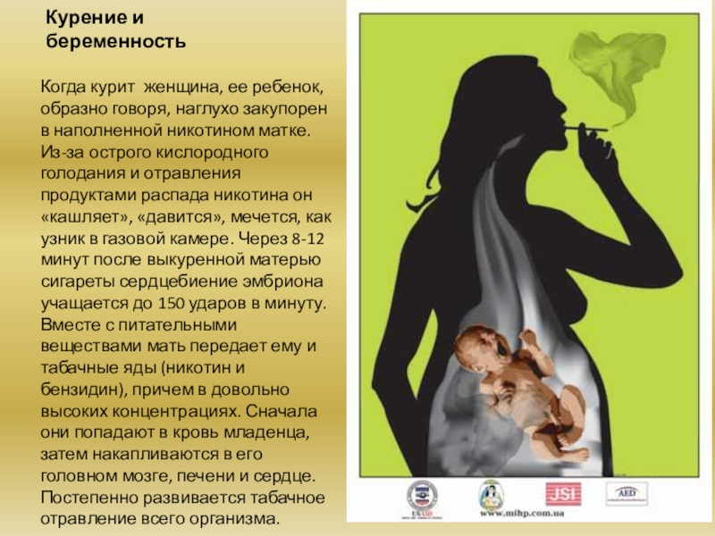 в наполненной никотином матке. Из-за острого кислородного голодания и отравления продуктами распада никотина он «кашляет», «давится», мечется, как узник в газовой камере. Через 8-12 минут после выкуренной матерью сигареты сердцебиение эмбриона учащается до 150 ударов в минуту. Вместе с питательными веществами мать передает ему и табачные яды (никотин и бензидин), причем в довольно высоких концентрациях. Сначала они попадают в кровь младенца, затем накапливаются в его головном мозге, печени и сердце. Постепенно развивается табачное отравление всего организма.