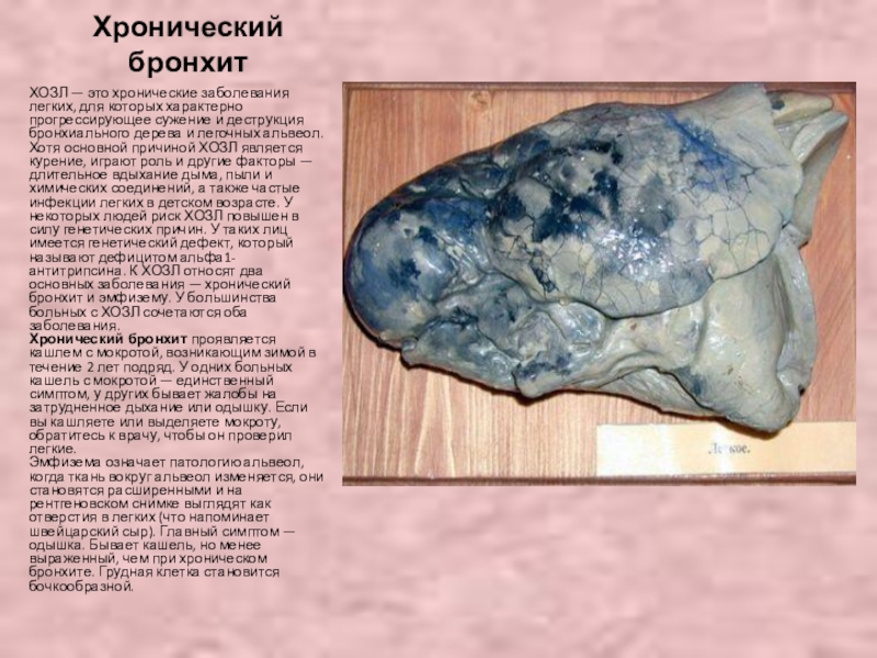 Хотя основной причиной ХОЗЛ является курение, играют роль и другие факторы — длительное вдыхание дыма, пыли и химических соединений, а также частые инфекции легких в детском возрасте. У некоторых людей риск ХОЗЛ повышен в силу генетических причин. У таких лиц имеется генетический дефект, который называют дефицитом альфа1-антитрипсина. К ХОЗЛ относят два основных заболевания — хронический бронхит и эмфизему. У большинства больных с ХОЗЛ сочетаются оба заболевания.