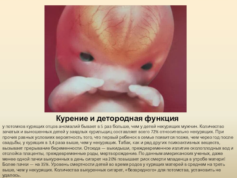 раз больше, чем у детей некурящих мужчин. Количество зачатых и выношенных детей у заядлых курильщиц составляет всего 72% относительно некурящих. При прочих равных условиях вероятность того, что первый ребенок в семье появится позже, чем через год после свадьбы, у курящих в 3,4 раза выше, чем у некурящих. Табак, как и ряд других психоактивных веществ, вызывает прерывание беременности. Отсюда — выкидыши, преждевременное излитие околоплодных вод и отслойка плаценты, преждевременные роды, мертворождение. По данным американских ученых, даже менее одной пачки выкуренных в день сигарет на 20% повышает риск смерти младенца в утробе матери! Более пачки — на 35%. Уровень смертности детей во время родов у курящих матерей в среднем на треть выше, чем у некурящих. Количества выкуренных сигарет, «безвредного» для потомства, установить не удалось.