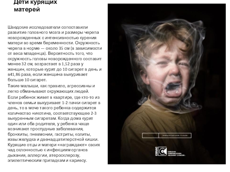Если ребенок живет в квартире, где кто-то из членов семьи выкуривает 1-2 пачки сигарет в день, то в моче такого ребенка содержится количество никотина, соответствующее 2-3 выкуренным сигаретам. Когда дома курят один или оба родителя, у ребенка чаще возникают простудные заболевания, бронхиты, пневмонии, гастриты, колиты, язвы желудка и двенадцатиперстной кишки. Курящие отцы и матери «награждают» своих чад склонностью к инфекциям органов дыхания, аллергии, атеросклерозу, эпилептическим припадкам и кариесу.