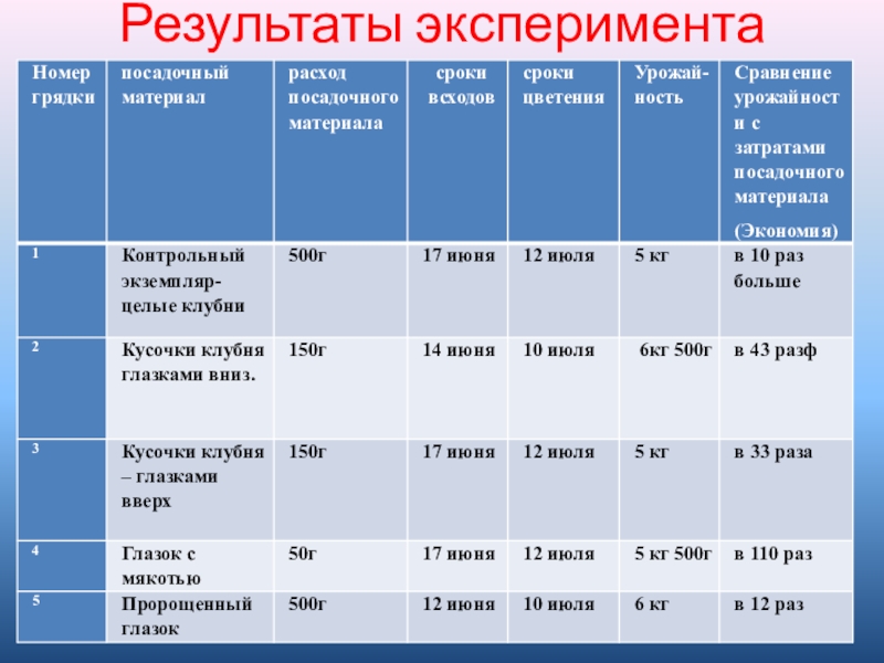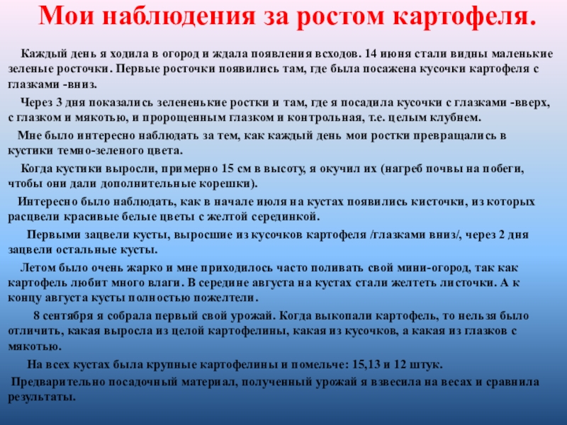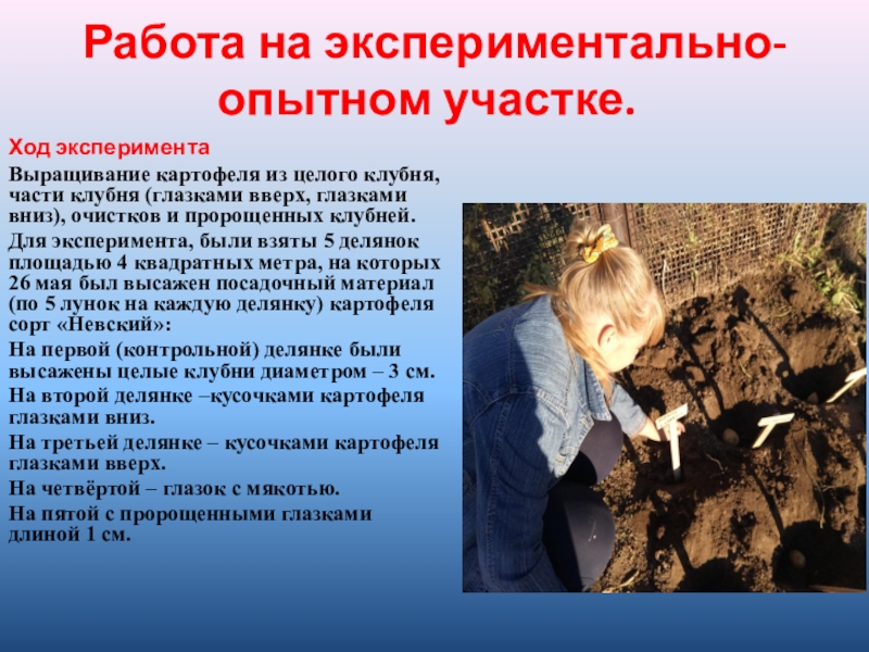 3.Провести эксперимент в летний период на экспериментально –опытном участке: вырастить урожай из целого клубня, части клубня (глазками вверх, глазками вниз), глазками с мякотью и пророщенных клубней.