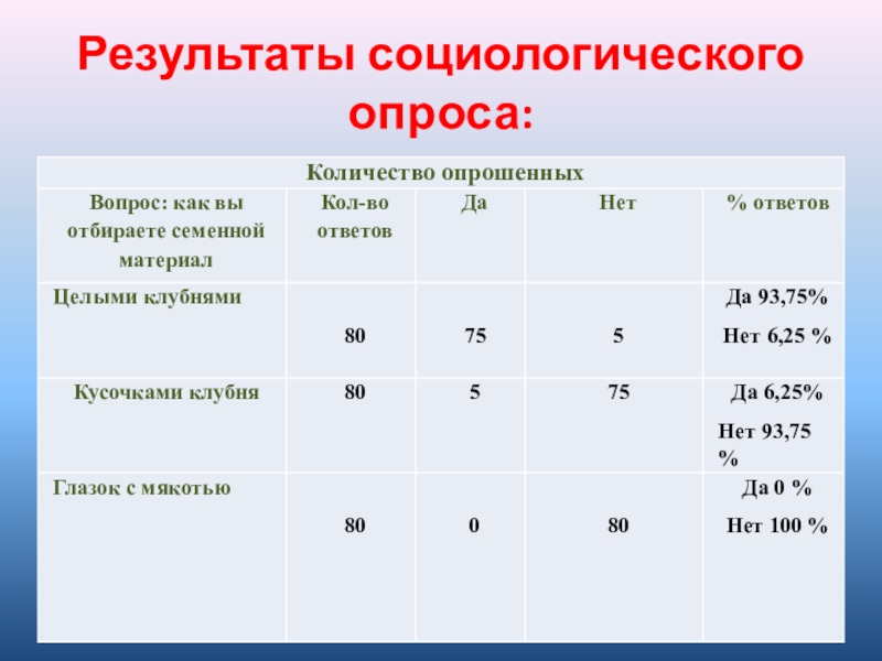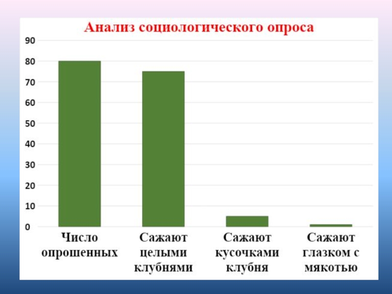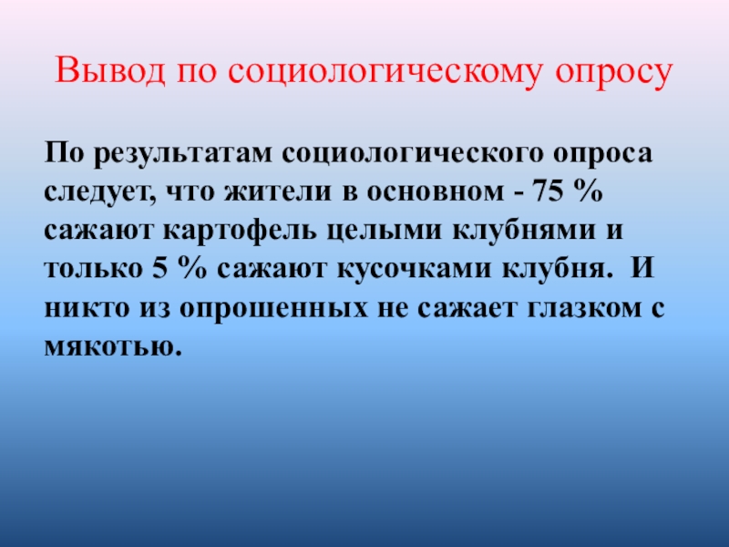 основном - 75 % сажают картофель целыми клубнями и только 5 % сажают кусочками клубня. И никто из опрошенных не сажает глазком с мякотью.