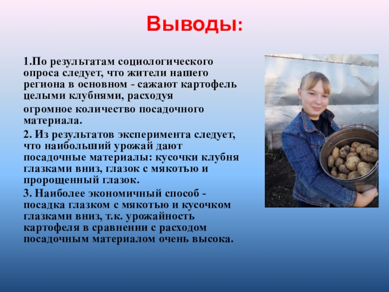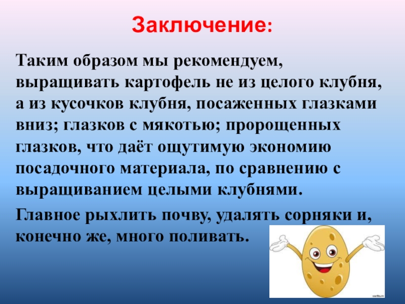 Рекомендовать жителям нашего выращивать картофель кусочками, как более выгодный и экономичный, требующий меньших затрат посадочного материала.