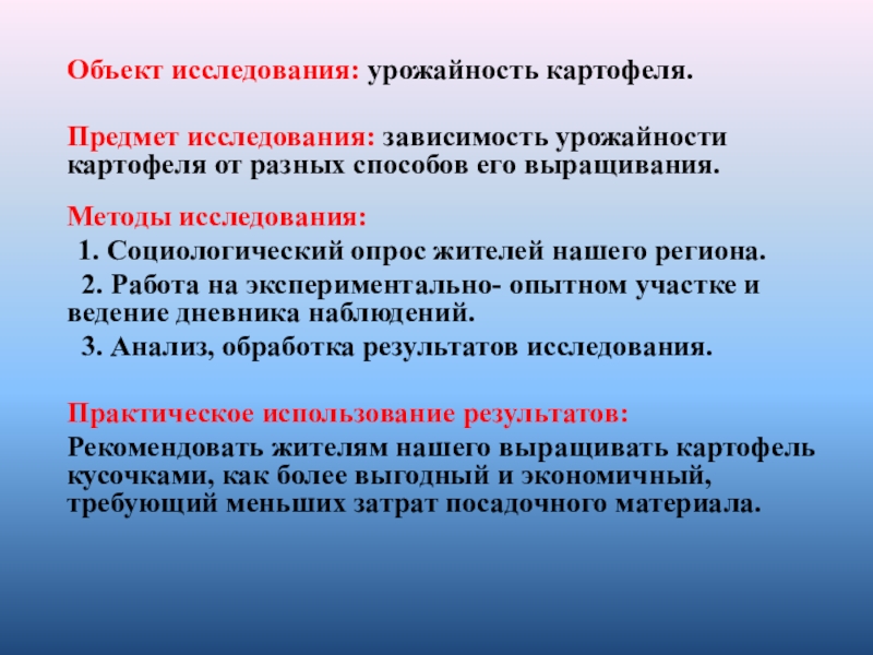 Предмет исследования: зависимость урожайности картофеля от разных способов