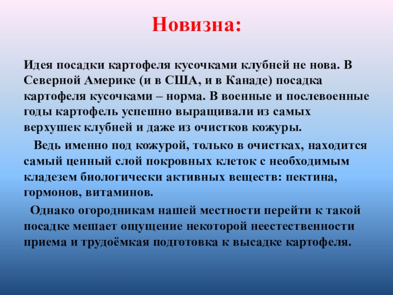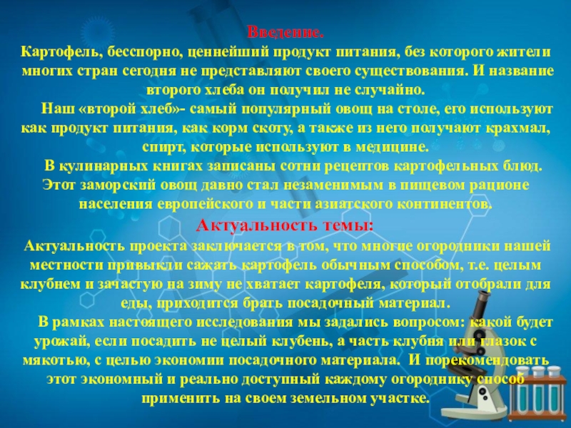 Актуальность проекта заключается в том, что многие огородники нашей местности привыкли сажать картофель обычным способом, т.е. целым клубнем и зачастую на зиму не хватает картофеля, который отобрали для еды, приходится брать посадочный материал.