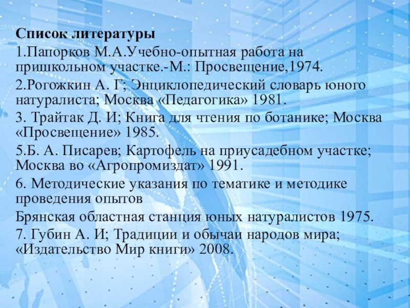 1.Папорков М.А.Учебно-опытная работа на пришкольном участке.-М.: Просвещение,1974.