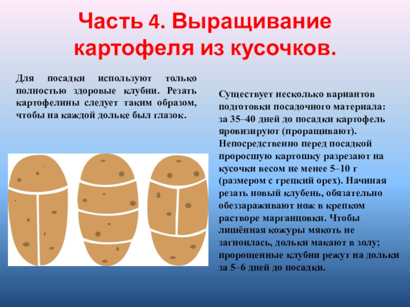 Слайд 11Часть 4. Выращивание картофеля из кусочков.