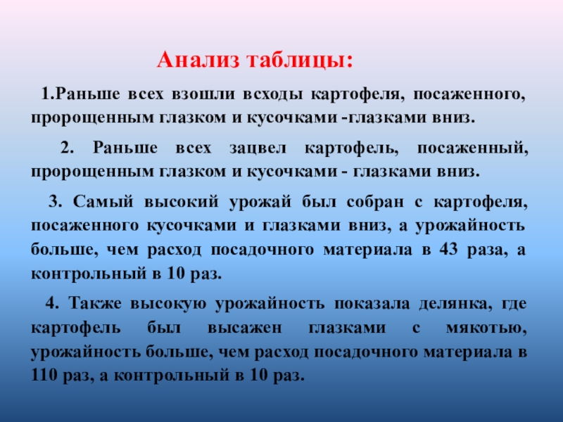 1.Раньше всех взошли всходы картофеля, посаженного, пророщенным глазком и кусочками -глазками вниз.