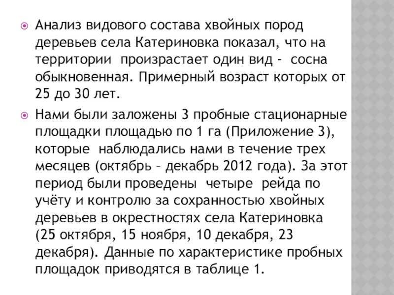 Нами были заложены 3 пробные стационарные площадки площадью по 1 га (Приложение 3), которые наблюдались нами в течение трех месяцев (октябрь – декабрь 2012 года). За этот период были проведены четыре рейда по учёту и контролю за сохранностью хвойных деревьев в окрестностях села Катериновка (25 октября, 15 ноября, 10 декабря, 23 декабря). Данные по характеристике пробных площадок приводятся в таблице 1.
