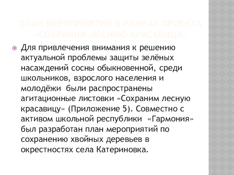 решению актуальной проблемы защиты зелёных насаждений сосны обыкновенной, среди школьников, взрослого населения и молодёжи были распространены агитационные листовки «Сохраним лесную красавицу» (Приложение 5). Совместно с активом школьной республики «Гармония» был разработан план мероприятий по сохранению хвойных деревьев в окрестностях села Катериновка.