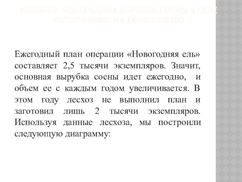 операции «Новогодняя ель» составляет 2,5 тысячи экземпляров. Значит, основная вырубка сосны идет ежегодно, и объем ее с каждым годом увеличивается. В этом году лесхоз не выполнил план и заготовил лишь 2 тысячи экземпляров. Используя данные лесхоза, мы построили следующую диаграмму: