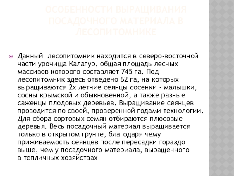 урочища Калагур, общая площадь лесных массивов которого составляет 745 га. Под лесопитомник здесь отведено 62 га, на которых выращиваются 2х летние сеянцы сосенки - малышки, сосны крымской и обыкновенной, а также разные саженцы плодовых деревьев. Выращивание сеянцев проводится по своей, проверенной годами технологии. Для сбора сортовых семян отбираются плюсовые деревья. Весь посадочный материал выращивается только в открытом грунте, благодаря чему приживаемость сеянцев после пересадки гораздо выше, чем у посадочного материала, выращенного в тепличных хозяйствах