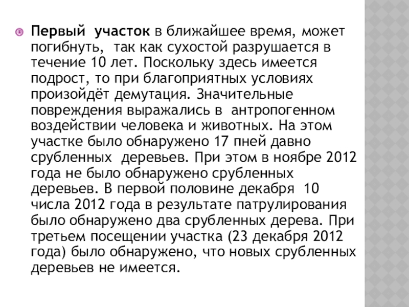 в течение 10 лет. Поскольку здесь имеется подрост, то при благоприятных условиях произойдёт демутация. Значительные повреждения выражались в антропогенном воздействии человека и животных. На этом участке было обнаружено 17 пней давно срубленных деревьев. При этом в ноябре 2012 года не было обнаружено срубленных деревьев. В первой половине декабря 10 числа 2012 года в результате патрулирования было обнаружено два срубленных дерева. При третьем посещении участка (23 декабря 2012 года) было обнаружено, что новых срубленных деревьев не имеется.