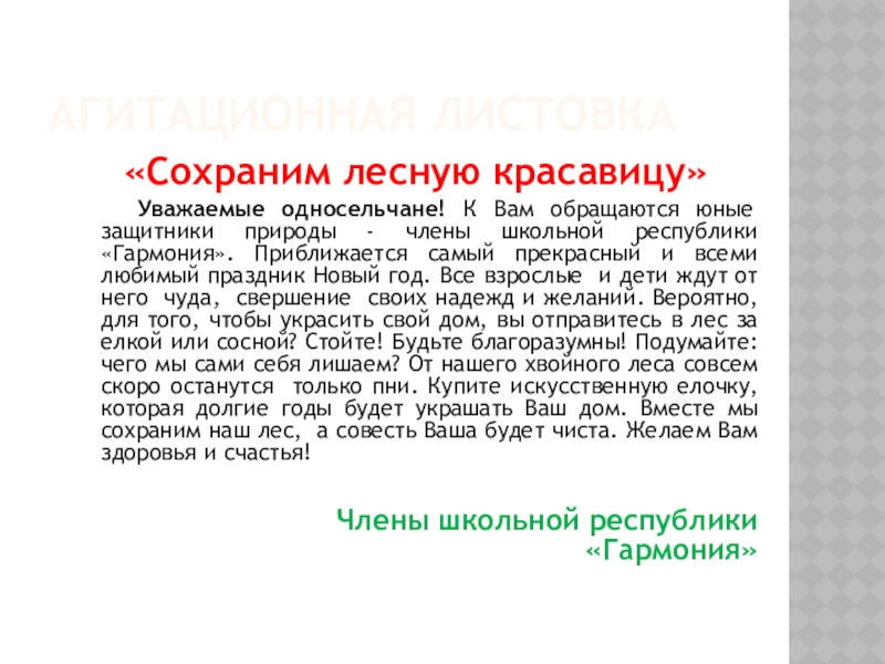 защитники природы - члены школьной республики «Гармония». Приближается самый прекрасный и всеми любимый праздник Новый год. Все взрослые и дети ждут от него чуда, свершение своих надежд и желаний. Вероятно, для того, чтобы украсить свой дом, вы отправитесь в лес за елкой или сосной? Стойте! Будьте благоразумны! Подумайте: чего мы сами себя лишаем? От нашего хвойного леса совсем скоро останутся только пни. Купите искусственную елочку, которая долгие годы будет украшать Ваш дом. Вместе мы сохраним наш лес, а совесть Ваша будет чиста. Желаем Вам здоровья и счастья!